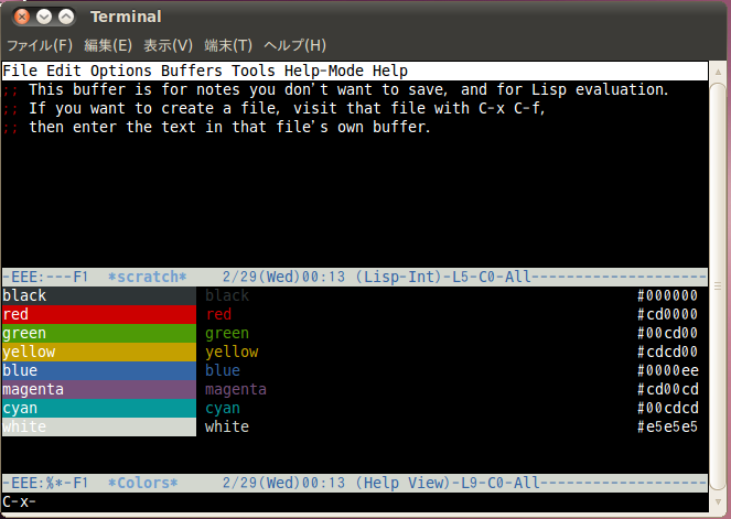 # パターン1 (547色) emacs # emacsを普通に開く (開いた後) M-x list-colors-display # パターン2 (8色) emacs -nw # emacsをno window オプションで開く (開いた後) M-x list-colors-display